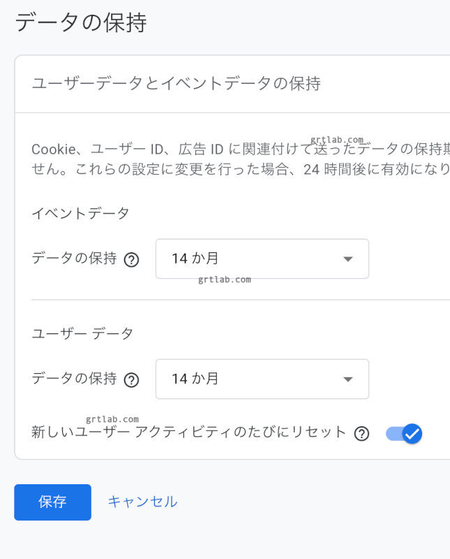 これで、特定のユーザーの行動ログ(探索レポートで見るデータ)が14ヶ月間保存されるようになります。