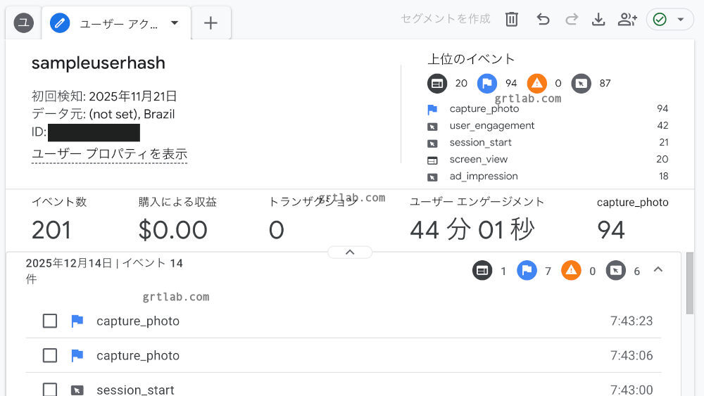 - 表に表示されるID(App Instance ID)をクリックすると、そのユーザーのイベント履歴が時系列で見られます。