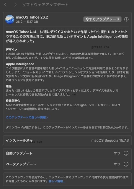 インストールはこちら自動ソフトウェアアップデート全てオフにしておきます。がアップデート要請のメッセージがよく出てくるので15..3から15.5にアップデートしてみました。macOSをアップデート...