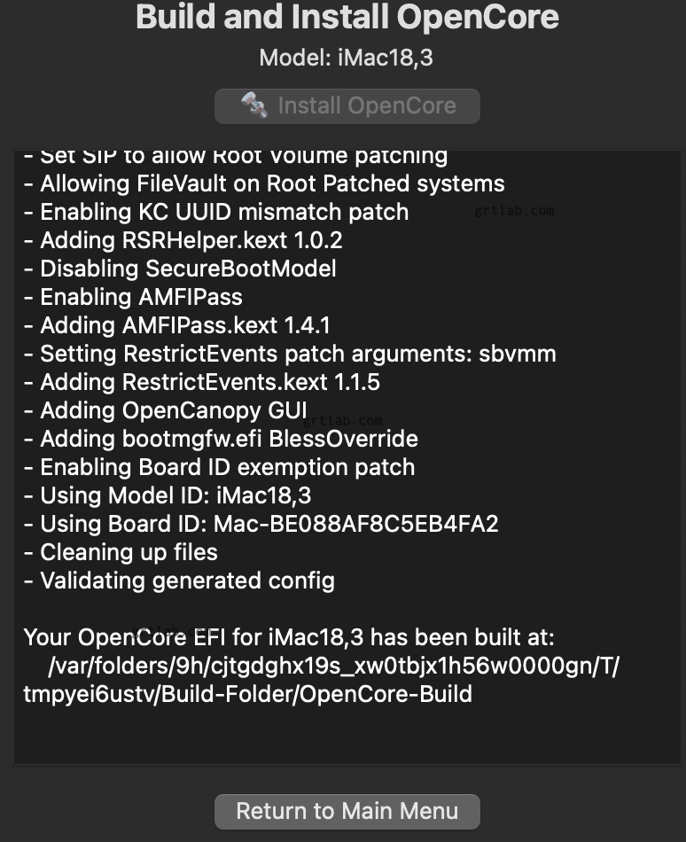 • EFIの書き換え: OCLPアプリの 「Build and Install OpenCore」 を実行し、内蔵ディスク(EFIパーティション)に最新の起動情報を書き込んでおきます。これをしないと、OSアップデート後の再起動でつまづくことがあります。