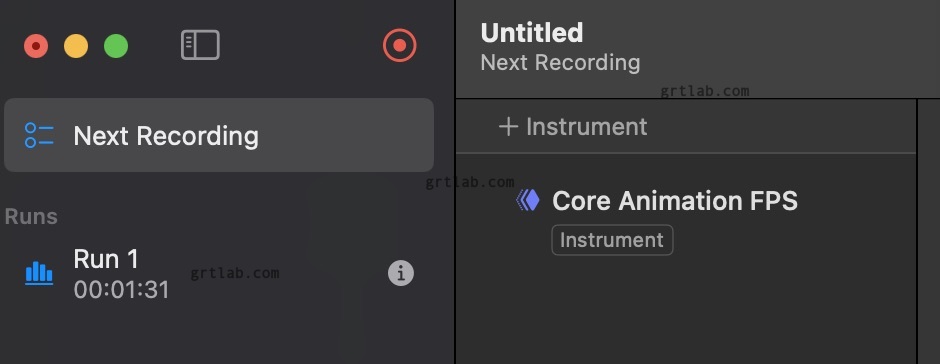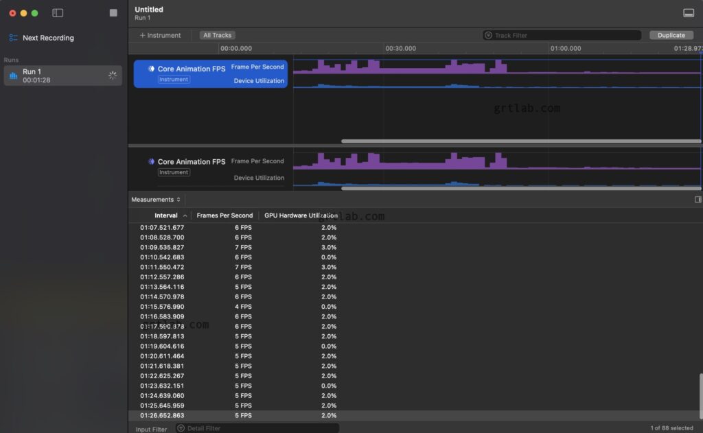 ●(Record) ボタンを押すとアプリが実機で起動し、リアルタイムのFPSがグラフで表示されます。